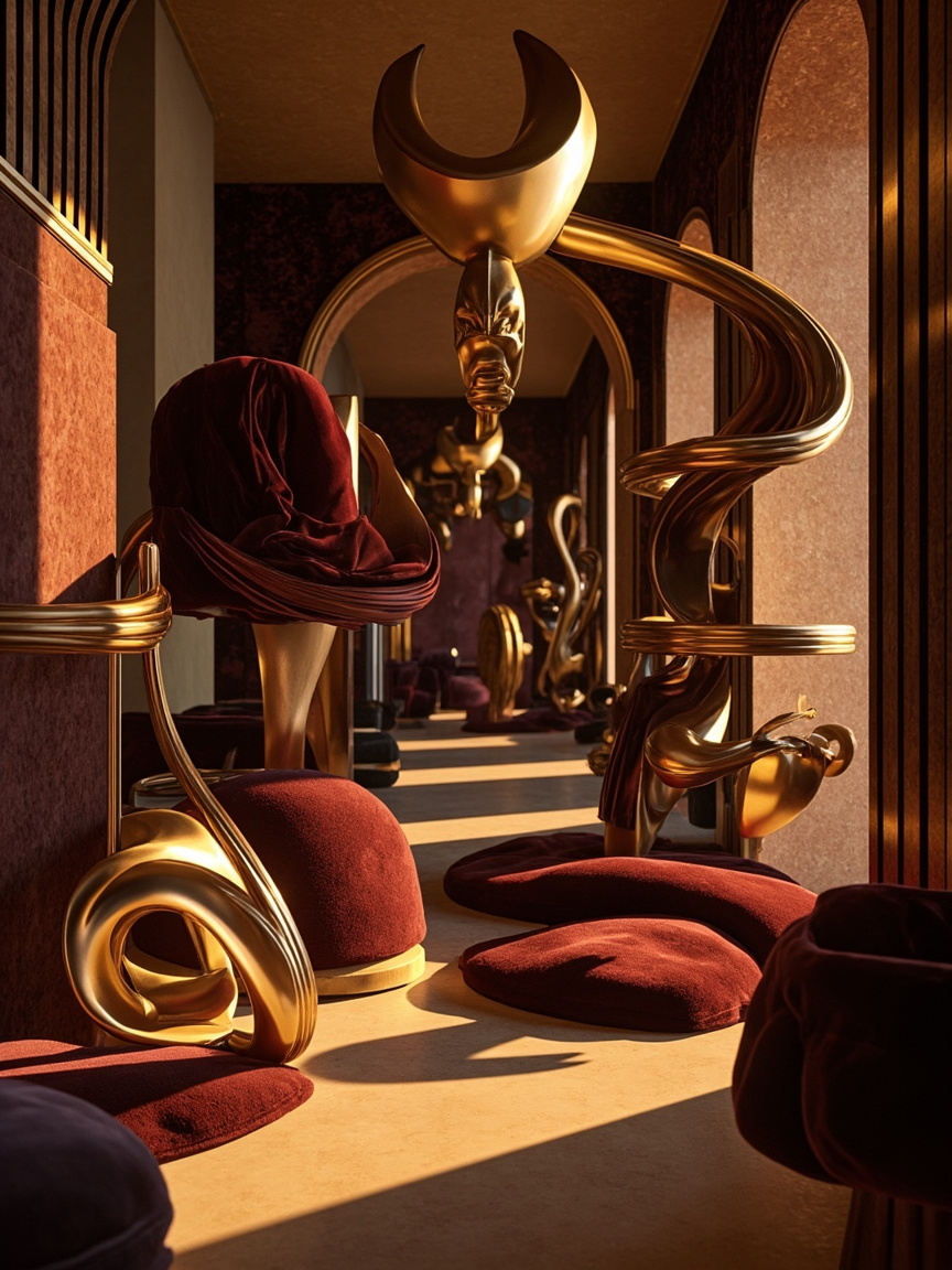 Lighting plays a key role — bronze sconces, glass chandeliers, and warm ambient glows that cast a nostalgic sheen over each room. The space should feel like a timeless evening — one part sophistication, one part soul.